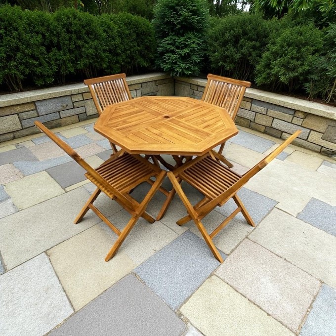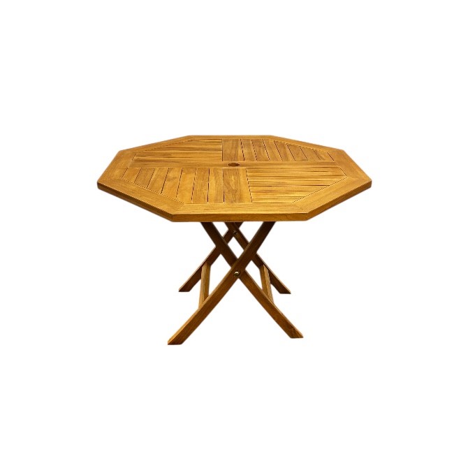 Each table has a teak wooden octagonal shaped table top that is 100 cm wide.